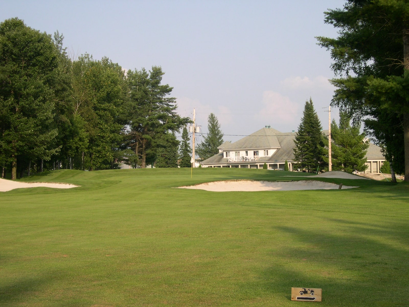 Trou 4: Normale 4. Du tertre de départ, il est difficile de voir l’allée. On doit y aller avoir un léger gauche droite à l’aveuglette. Un hybride ou bois 3 est de mise afin de garder votre balle en jeu. Le vert est très étroit!